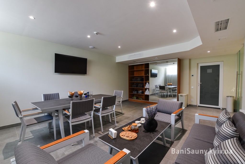 🛋️ Просторная комната отдыха с большим столом, диваном, креслами и телевизором – отличное место для приятного общения или просмотра спортивных матчей.